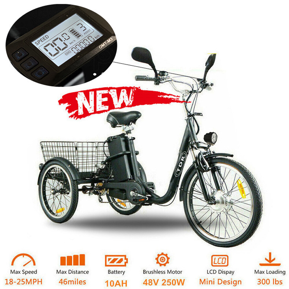 Black 48v Electric Trike Tricycle 3 Wheeler Cycle Power Assist 250w 10ah Bike Ebay